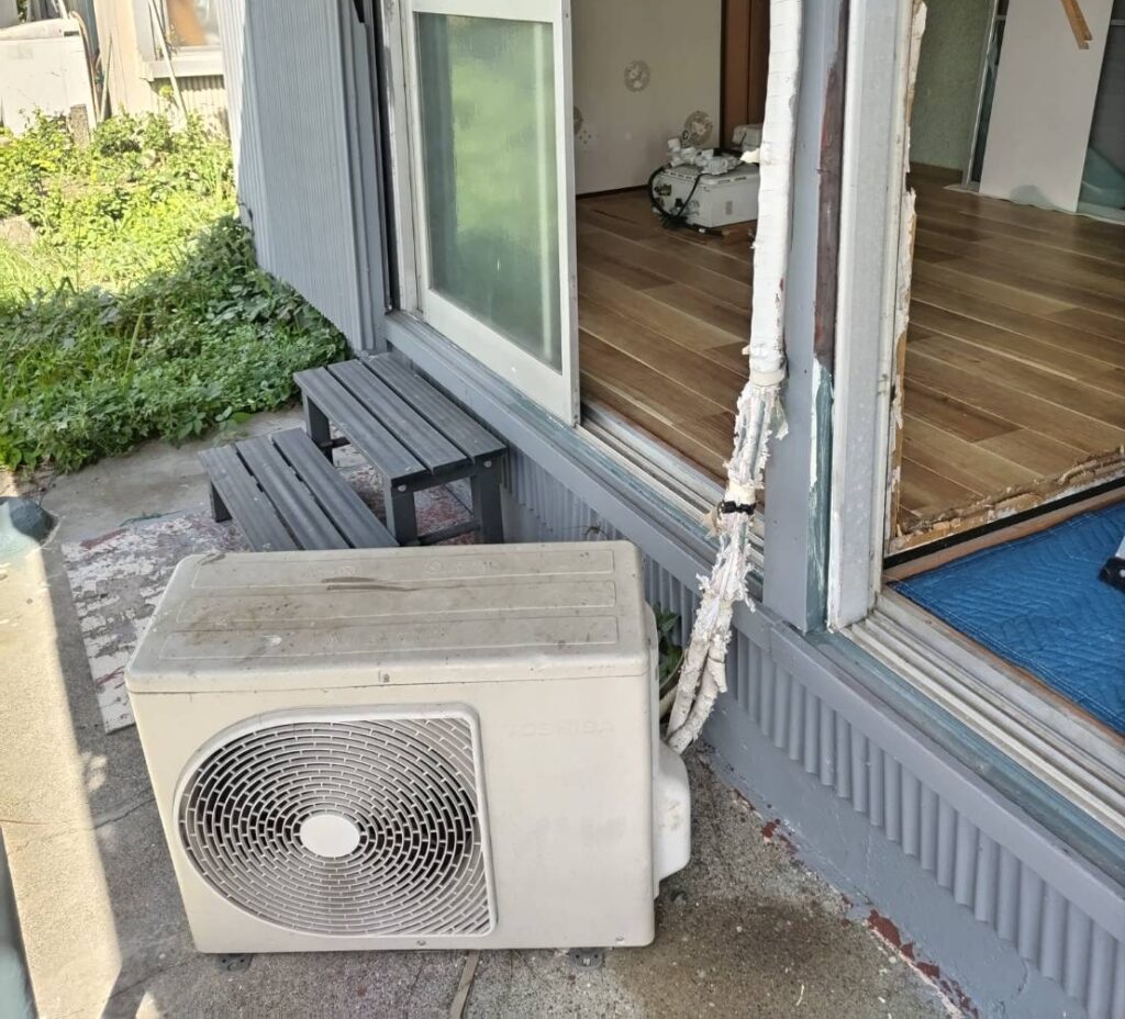室外機と繋がっている配管は、テープが剥がれ銅管を覆っている被膜もボロボロになっています😅